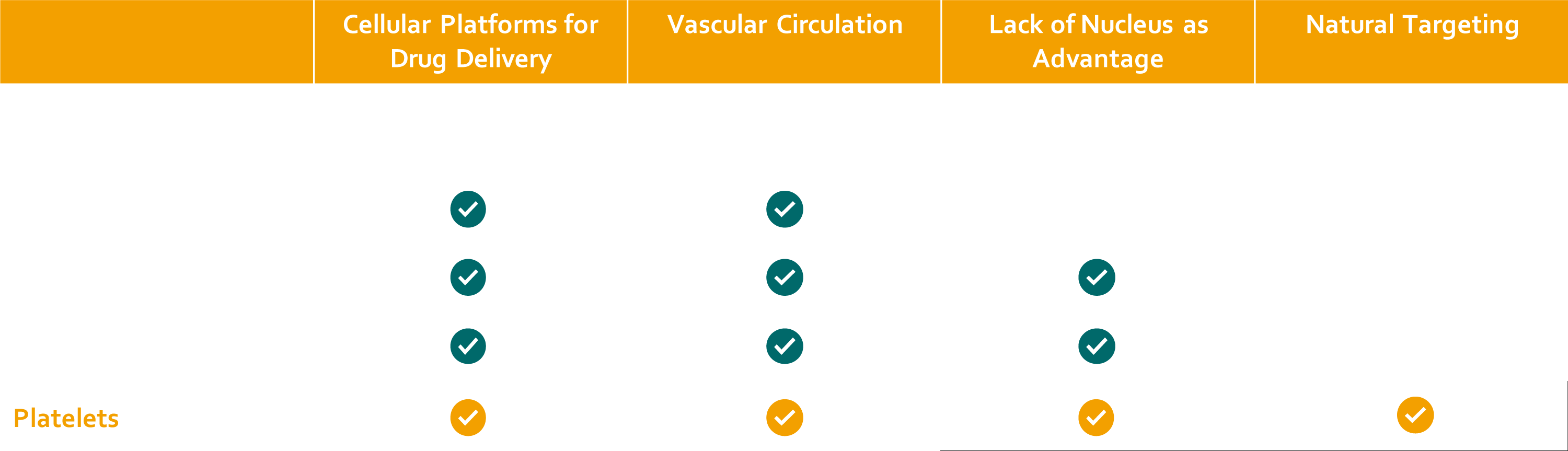 Platelets are versatile cells that perform many essential functions in addition to plugging vessel walls. They are the Swiss army knives of the blood. They are best-known for their ability to stop bleeding, but they also naturally function as the host transport and delivery system for many essential growth factors. Platelets normally function like a sponge, picking up specific proteins and antibodies, delivering factors to tumors, and are cleared by the liver. We’re simply using biologically inspired engineering to hijack these natural platelet functions designed by mother nature.